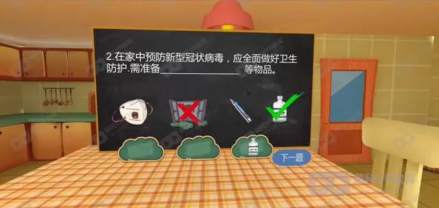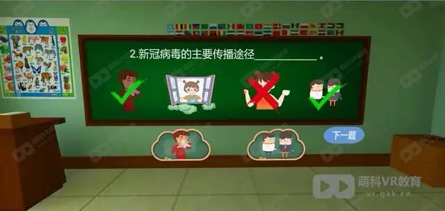 在沉浸式VR场景中,利用交互答题的方式让学生学习并记忆哪些地方容易沾染病毒、病毒如何传播、发病症状、如何做好自我防护等知识点。